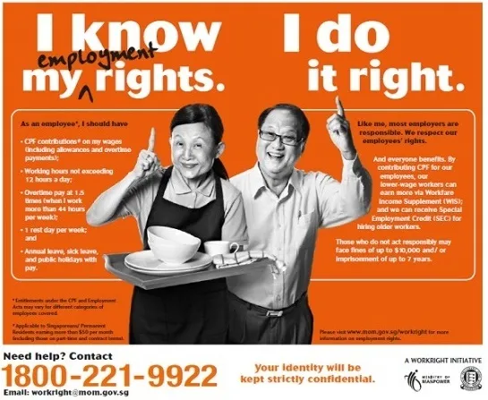 "These enhanced enforcement efforts will complement a new 'I Know My Employment Rights, I Do It Right.' campaign which aims to educate workers on their employment rights under the CPF Act and EA, as well as to educate employers about their legal obligations. The campaign will start on 29 Sep 2012 and leverage channels such as print, TV and radio. The public can also find out more about their employment rights at www.mom.gov.sg/workright," they added.