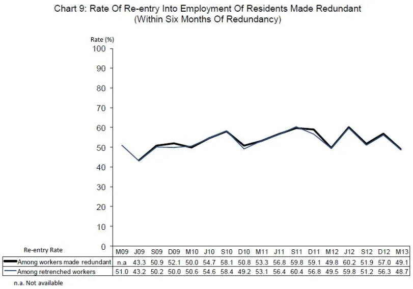 According to the latest report by MoM, the rate of re-entry into employment declined, after rising in the preceding quarter. Based on CPF records, nearly one in two (49%) residents laid off in the fourth quarter of 2012 secured employment by March 2013 (i.e. within six months of redundancy), down from the 57% experienced by the previous cohort (laid off in the third quarter of 2012) in December 2012.