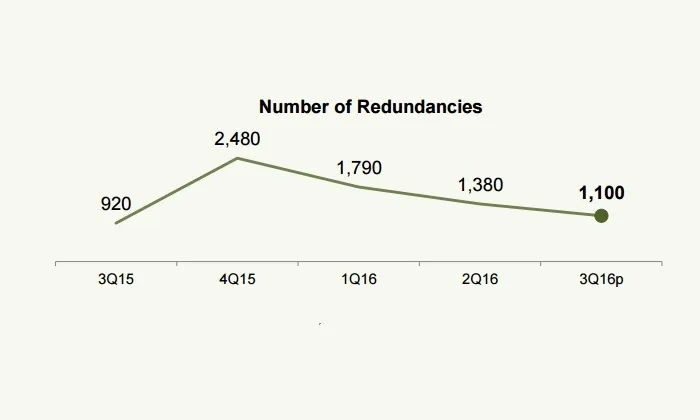 For 3Q16, layoffs were reduced to 1,100, over 20% lower than 2Q16's 1,380. It is important to note, however, that it is still up from a year ago, where redundancies were at a low 920.