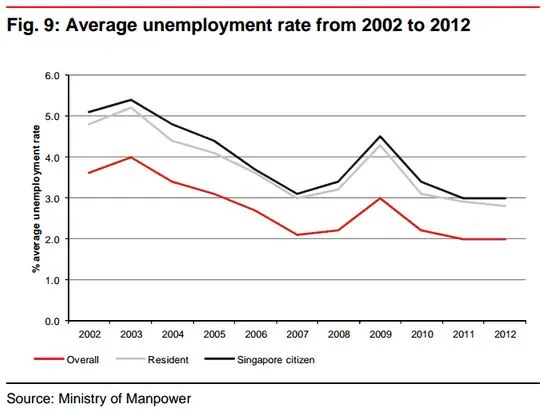 At this stage the impact from the restructuring appears to be well contained. With the tight labor market, the average resident unemployment rate in 2012 was a low 2.8% while the average unemployment rate for Singaporeans in 2012 was 3.0%.