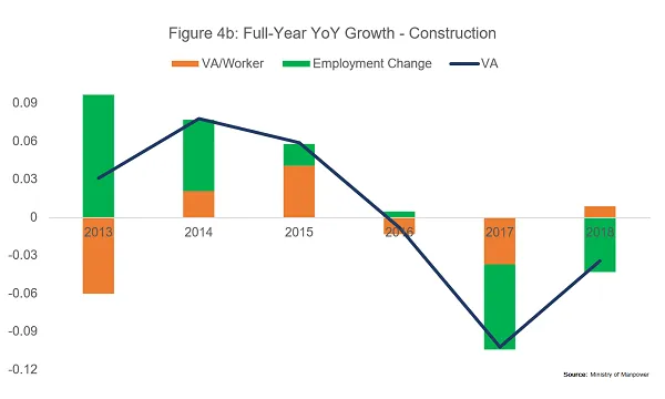 Employment in Singapore's construction sector continued to contract in 2018 albeit at a slower pace as the number of employed workers fell by 7,100 in 2018, according to the Ministry of Manpower.