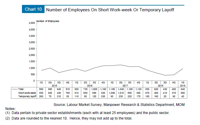 This chart from the Ministry of Manpower (MoM) shows that employees on short work-week more than doubled (143%) MoM to 900 in Q1 2019 from 370 in Q4 2018.