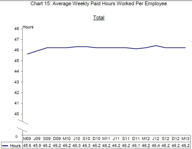 According to the latest report by MoM, total weekly paid hours worked per employee averaged 46.2 hours in March 2013, largely unchanged since September 2009, after rising from the trough of 45.6 hours in March 2009.