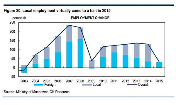 According to a report by Citi, out of 32.3k jobs created in 2015, local employment was flat at just 0.7K.