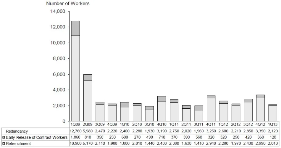 According to MoM's latest report, redundancy declined, after rising in the preceding two quarters. 2,120 workers were made redundant in the first quarter of 2013. This was lower than the 3,350 workers affected in the preceding quarter and 2,600 in the first quarter of 2012.