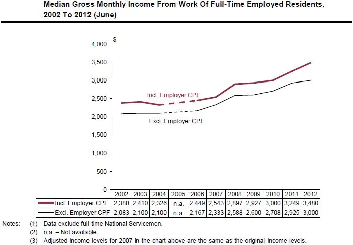 When adjusted using CPI excluding the imputed rentals, the growth in real median income (including employer CPF contributions) was 3.3% in 2012, compared with 3.9% in 2011.