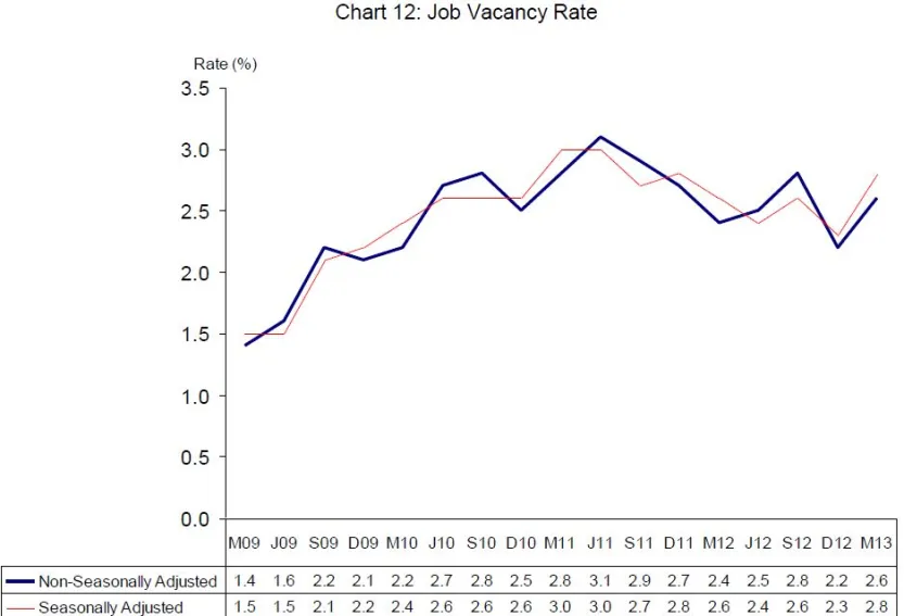 According to MoM, job openings rose, after declining in the previous quarter. The seasonally adjusted vacancies increased over the quarter by 17% in March 2013, reversing the decline of 7.0% in December 2012.