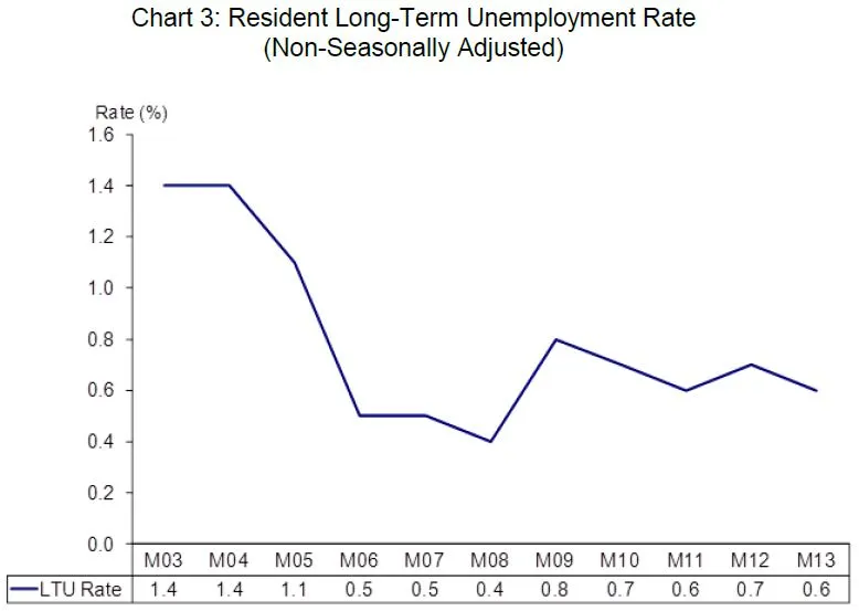 According to the latest report by MoM, long-term unemployment improved slightly over the year. 13,700 unemployed residents making up 0.6% of the resident labour force in March 2013 had been looking for work for at least 25 weeks, down from 14,000 or 0.7% a year ago.