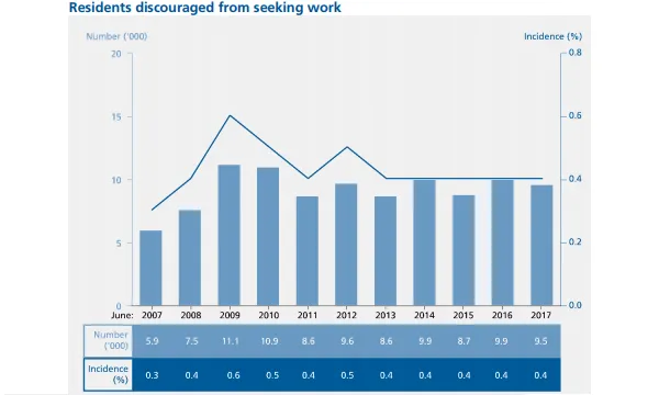 The incidence of discouraged workers has stayed low at 0.4% of the resident labour force, inclusive of discouraged workers, since 2013.