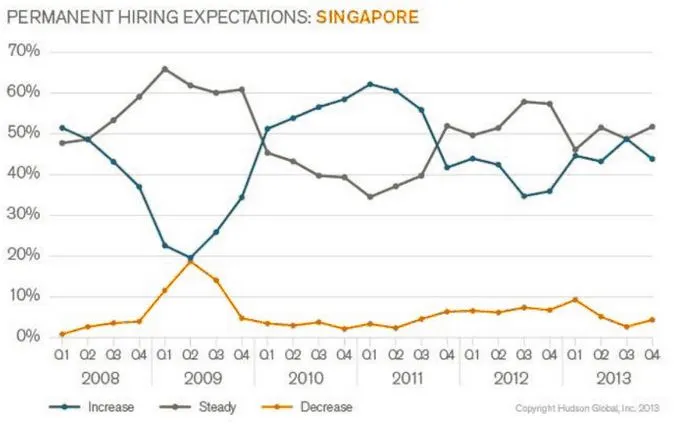 Hiring intentions remain steadily optimistic in Singapore, with 43.8% of employers expecting to increase headcount (down 4.9pp) according to the latest Hudson Report: Employment Trends released recently.
