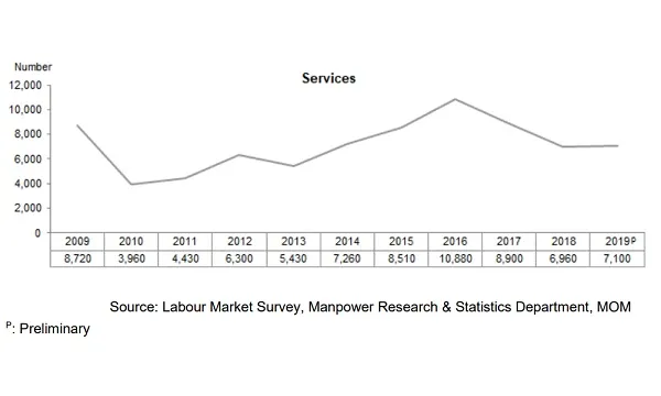 This chart from the Ministry of Manpower (MOM) reveals that the number of retrenchments in the services sector grew to 7,100 in 2019, compared to 6,960 in 2018, based on preliminary estimates. It took up the bulk or 66% of all retrenchments in the city.