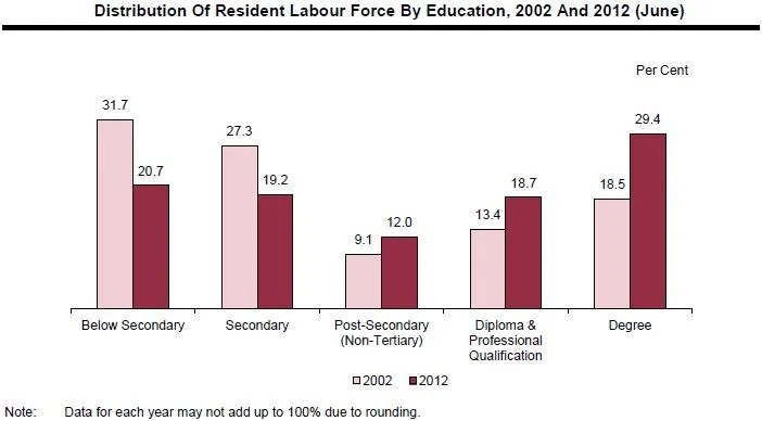Including those with diploma & professional qualifications, the tertiary educated made up close to half or 48% of the resident labour force in 2012 compared with nearly one in three or 32% ten years ago.