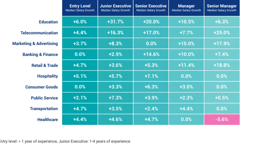 Industries with the most salary increases include Banking & Finance, Consumer Goods, Public Service, Retail & Trade, Telecommunication, and Transportation.