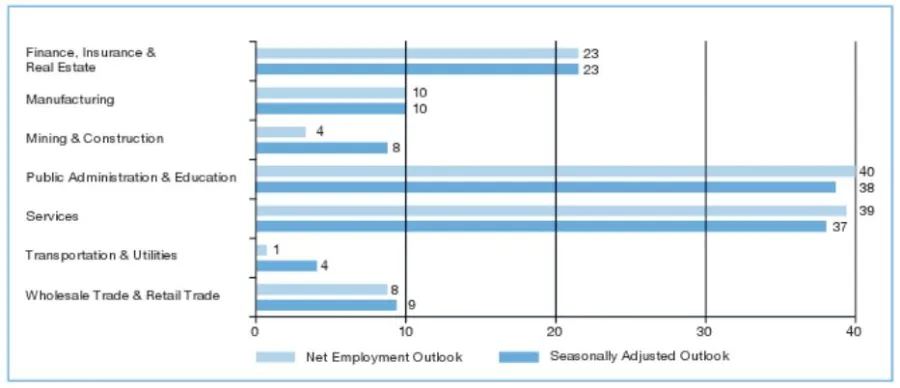 The most optimistic hiring plans are reported in the Public Administration & Education sector and the Services sector, with Net Employment Outlooks of +38% and +37%, respectively.