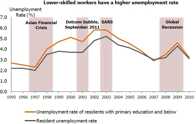 Lower-skilled Singaporeans are less internationally mobile and will be more affected when growth slows.
