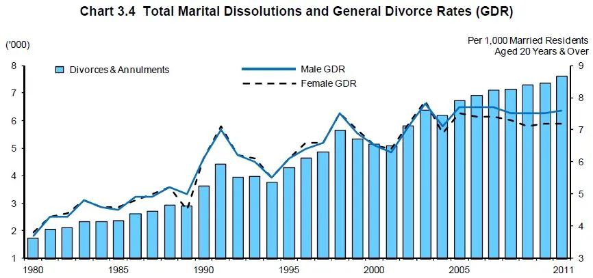 According to SingStat, there were 7,604 marital dissolutions (i.e. divorces and annulments) in 2011, an increase from the 7,338 marital dissolutions in 2010.