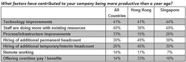 In contrast to Singapore where the push is to get existing staff to do more, Hong Kong companies have realised productivity gains from increasing their permanent head count (49 per cent) and technology improvements (40 per cent).