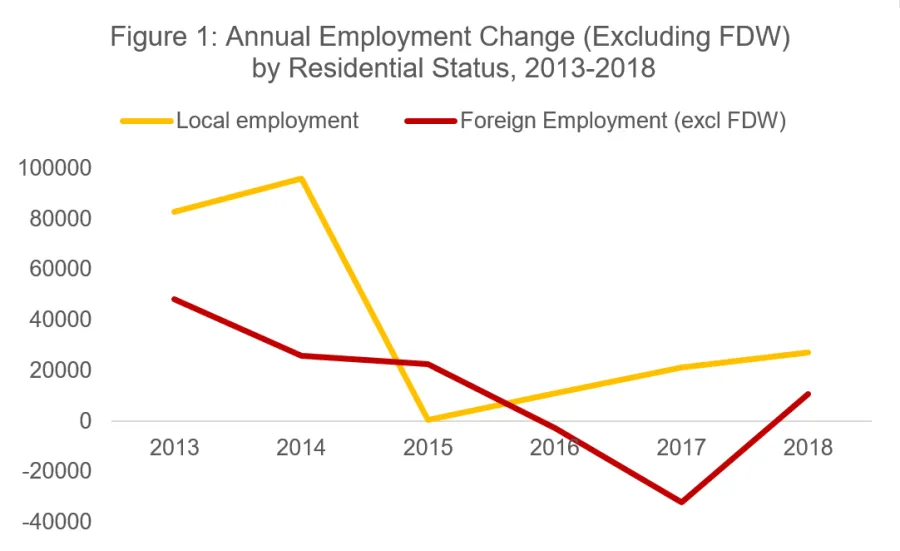 Local employment growth in 2018 (+27,400) was also higher than a year before (+21,300). Growth occurred mainly in Community, Social & Personal Services, Transportation & Storage, Financial Services, Information & Communications, and Professional Services.