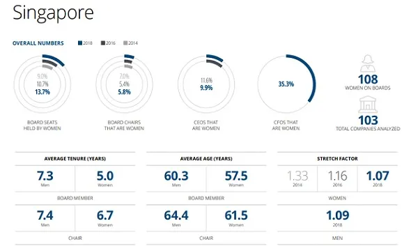 Amongst board chairs positions, 5.8% in Singapore are occupied by women, compared to 4.2% across Asia and 5.3% globally.