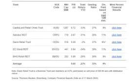 CapitaLand Retail China Trust led the declines with a 33% drop in returns.