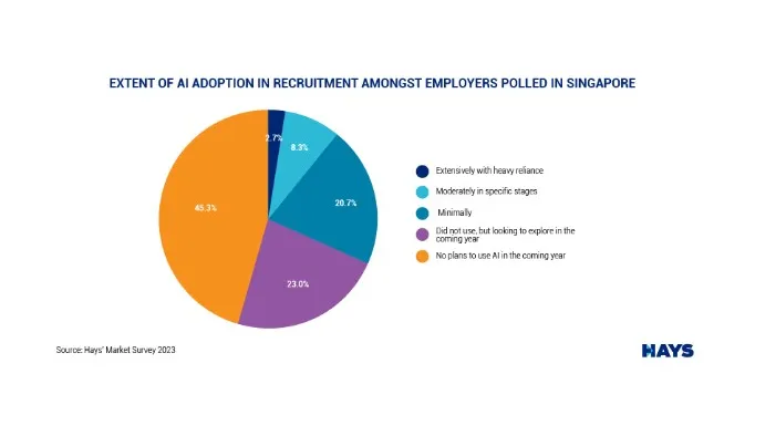 Four in 10 (45.3%) employers in Singapore have no plans to use artificial intelligence (AI) in their recruitment processes yet, Hays reported.