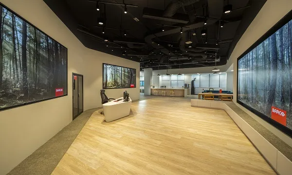 Barco’s new facilities in the new office adhere to the "Bring Your Own Meeting trend" which means employees can utilise the audio and video tools available in the huddle spaces; it also acts as a showroom for both visitors and customers.
