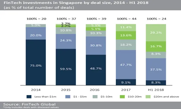 "There was an absence of deals valued above $10m in 2014. However, this category’s share subsequently increased year-on-year; in 2017, a quarter of all deals were larger than $10m. This trend continued in H1 2018 with 45.8% of investments in this range," Fintech Global added.