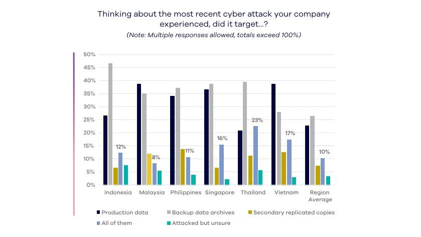 Attacks on production, secondary, and backup environments were highest in Singapore (16%), Vietnam (17%), and Thailand (23%).