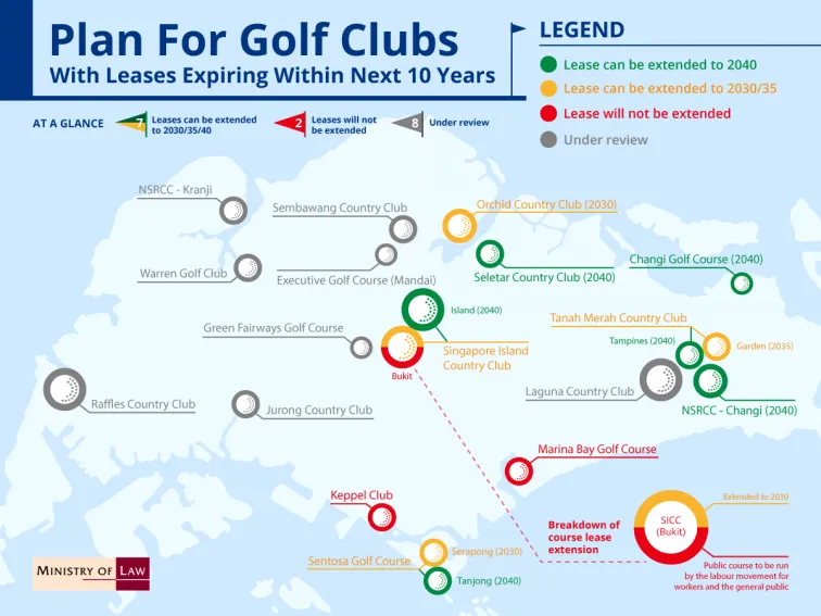 According to the Ministry of Law, the leases of seven golf clubs will expire in the next 10 years. They will be offered new leases for some of their courses. The leases will be for differing periods which will end between 31 December 2030 and 31 December 2040.