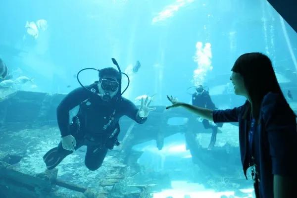 The centerpiece of the Aquarium is the Open Ocean habitat, seen through the world’s largest viewing panel, at 36 metres wide by 8.3 metres tall; Guests viewing the habitat could experience the feeling of being on a cavernous ocean floor.