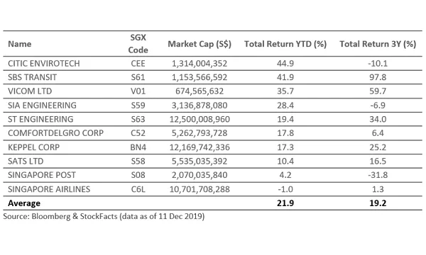 CITIC Envirotech leads the pack with a total return of 44.9%. This is followed by SBS Transit at 41.9%, Vicom 35.7%, SIA Engineering at 28.4% and ST Engineering 19.4%.