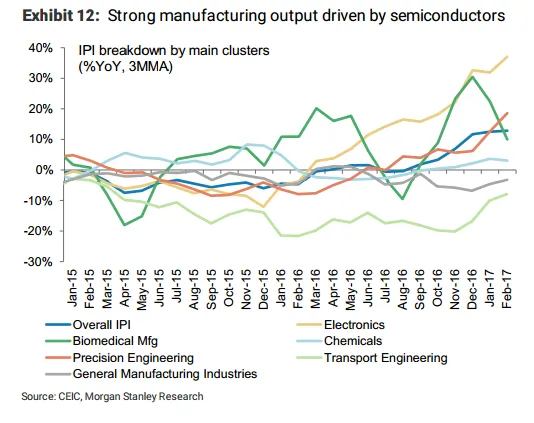 Meanwhile, the electronic manufacturing cluster, which is the other key driver of the manufacturing resurgence in 4Q16, continued to grow strongly at 30.1% YoY over January-February 2017, on the back of semiconductors.