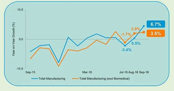 Singapore saw a surprise uptick in manufacturing output in September, jumping 6.7% YoY. This was mainly attribtued to strong biomedical manufacturing cluster, which soar 22.2% in the said month.