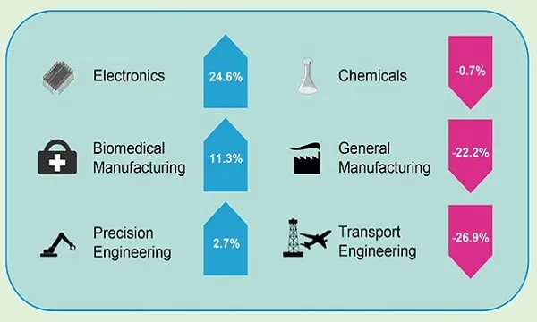 While electronics registered a 24.6% growth as biomedical manufacturing posted 11.3% expansion, general manufacturing output plummeted 22.2%.