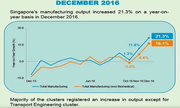 Singapore's manufacturing output increased 21.3% in December 2016. Excluding biomedical manufacturing output grew 16.1%.