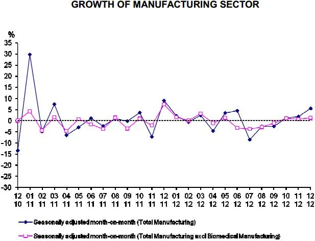 On a seasonally adjusted month-on-month basis, manufacturing output grew 5.4% in December 2012 compared to November 2012. Excluding biomedical manufacturing, output increased 1.2%.