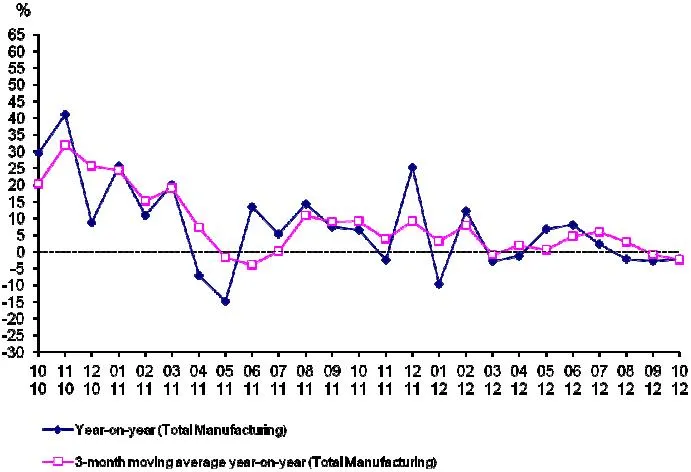 On a three-month moving average basis, manufacturing output contracted 2.4% in October 2012, compared to a year ago.