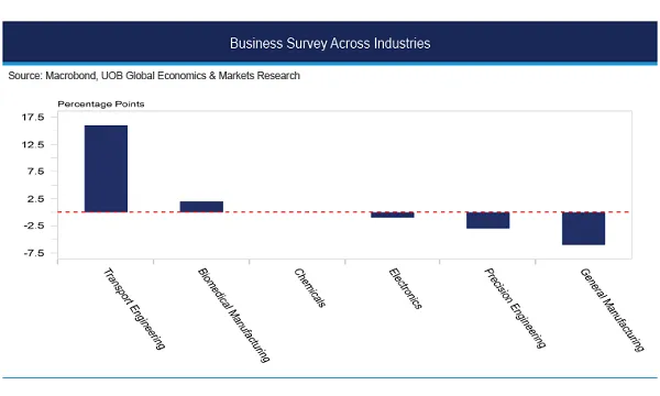 This chart from UOB shows that the general manufacturing, precision engineering and electronics segments have overall pessimistic views for the rest of the year.