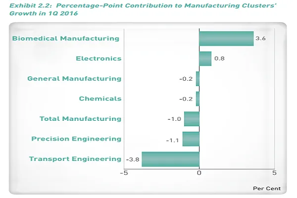 Other manufacturing clusters are not doing so well either. Output of the precision engineering cluster dropped by 8.4%, while the chemicals cluster contracted by 2.7%. Output of the general manufacturing industries also fell by 1.5% in the first quarter.