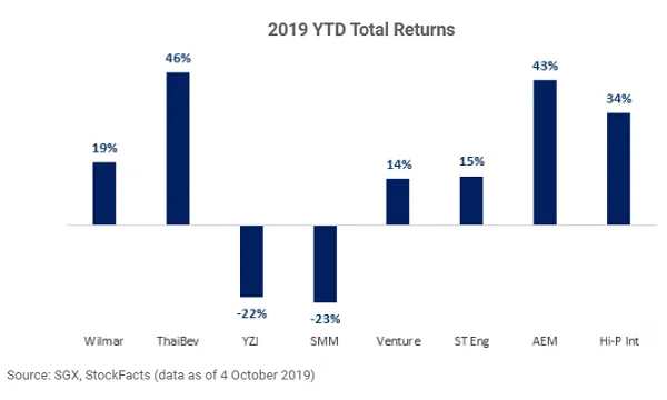 ThaiBev leads the pack with a 46% total return, followed by AEM Holdings at 43%, Hi-P International at 34%, Wilmar International at 19%, ST Engineering at 15% and Venture Corporation at 14%. The two maritime plays Sembcorp Marine and Yangzijiang recorded negative returns of 23% and 22%, respectively.