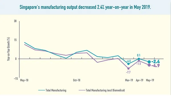 Manufacturing output fell 2.4% YoY, or 0.7% MoM, in May, according to the Economic Development Board.
