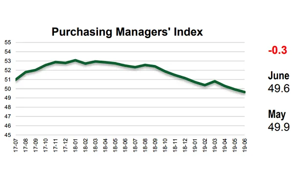 PMI falls to near three-year low in June