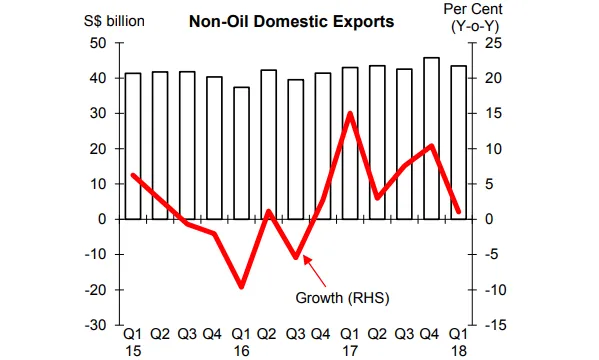 Singapore's non-oil domestic exports (NODX) rose 1.1% YoY in the first quarter of 2018, easing from the 10.4% jump last quarter, due to declines in electronics (-7.9%) offset by increased shipments of non-electronic products (+4.5%).