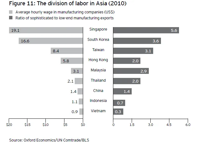 The chart on the right which was screen grabbed from Ernst & Young report titled 'Beyond Asia:New patterns of trade" compares average hourly rates of compensation in manufacturing across countries to the relative value of sophisticated exports (defined as machinery and transport equipment and passenger cars) to low-end manufactured exports (defined as other manufactured goods).