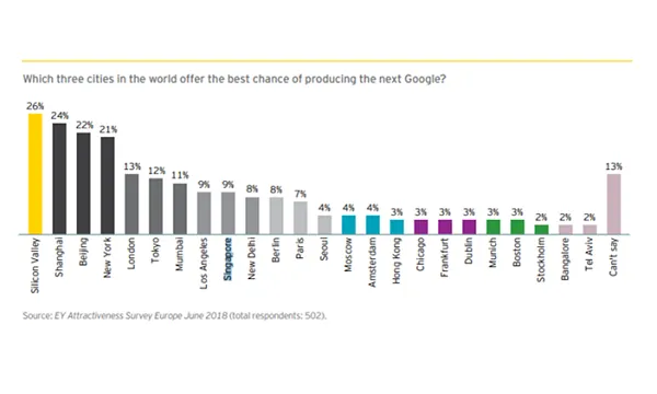 "As this was an open-ended question, the cities reflected in the chart are top-of-mind cities that investors think have the best chance of producing the next Google," EY added.