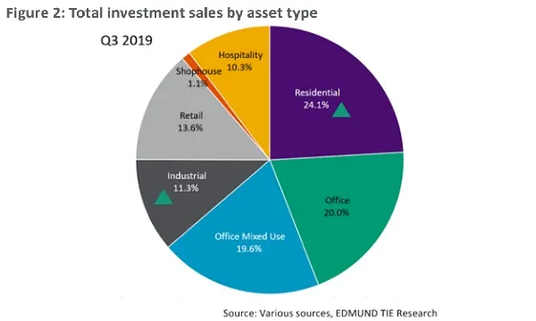 This chart from Edmund Tie and Co. reveals the breakdown of Singapore-bound investments in Q3, with the residential market (24.1%) making up almost a quarter of total investment sales during the period.