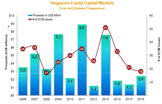 Singapore-based companies tapped the equity capital markets and raised US$2.4 billion until mid-June, data from Thomson Reuters show. This marks a 79.3% increase in proceeds compared to the first half of 2015, during which companies raised a mere US$1.3 billion.