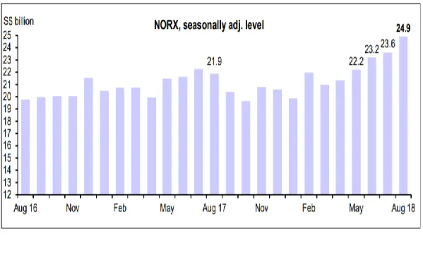 This chart from Enterprise Singapore shows that non-oil re-exports expanded by 14.1% YoY to $24.9b in August. NORX in August was at its two-year high amidst the growth in both electronic and non-electronic NORX.