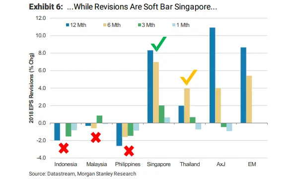 Meanwhile, Morgan Stanley expects that the bout of positive earnings estimate revisions in Singapore will slow. Analyst Nick Lord said banks (48% of MSCI Singapore) have seen a 15% increase to 2018 earnings expectations over the last 12 months, with 5% year to date.