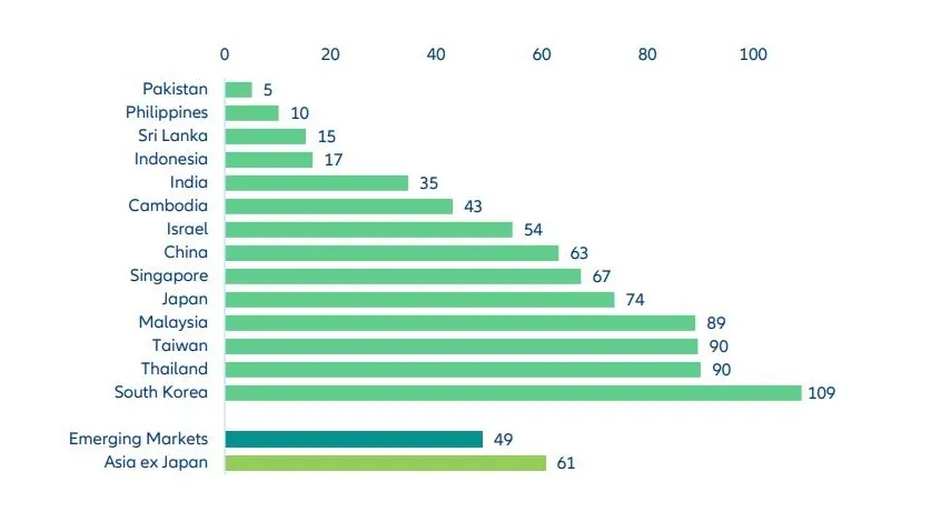 This chart from the Allianz Global Wealth Report 2022 shows the rankings of countries in Asia except Japan based on their debt as a percentage of the gross domestic product (GDP) in 2021 from lowest to highest.